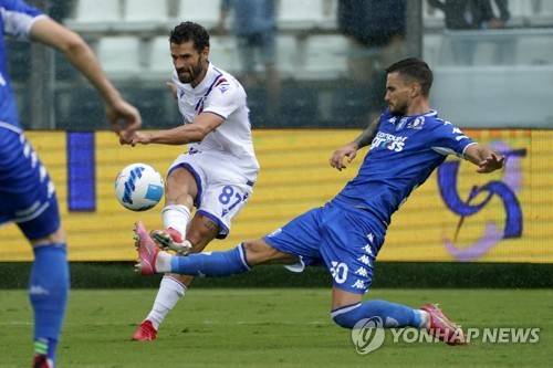 Sampdoria's Antonio Candreva, left, scores his side's third goal during a Serie A soccer match between Empoli and Cagliari, in Empoli's Castellani Stadium, Italy, Sunday, Sept 19, 2021. (Marco Bucco/LaPresse via AP) ITALY OUT