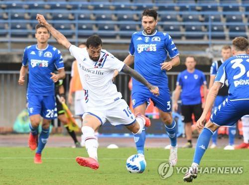 epa09476300 Sampdoria's midfielder Francesco Caputo scores the 2-0 lead during the Italian Serie A soccer match between Empoli FC vs U.C. Sampdoria at Carlo Castellani Stadium in Empoli, Italy, 19 September 2021. EPA/CLAUDIO GIOVANNINI