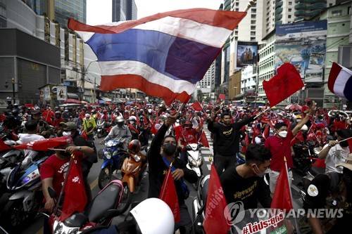 epa09476309 Anti-government protesters flash the three finger salute at a car mob rally calling for the resignation of the prime minister in Bangkok, Thailand, 19 September 2021. The demonstration calling for the resignation of the Thai Prime Minister, blaming him for the government's failure in handling the COVID-19 crisis, was held in conjunction with the 15th anniversary of the military coup against then-premier Thaksin Shinawatra on 19 September 2006. EPA/DIEGO AZUBEL