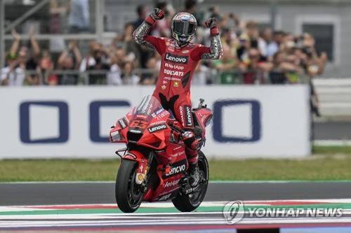 Italy's Francesco Bagnaia rides his Ducati as he celebrates winning the San Marino MotoGP race, at the Misano circuit in Misano Adriatico, Italy, Sunday, Sept. 19, 2021. (AP Photo/Antonio Calanni)