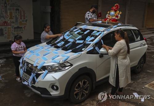 An Indian family decorates their car with face masks prior to joining a procession where idols of elephant-headed Hindu god Ganesha are taken for immersion in the Hussain Sagar Lake on the final day of Ganesh Chaturthi festival in Hyderabad, India, Sunday, Sept. 19, 2021. (AP Photo/Mahesh Kumar A.)