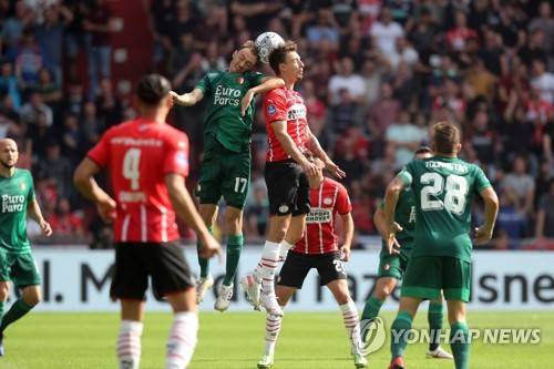 epa09476344 Fredrik Aursnes (CL)of Feyenoord and Olivier Boscagli of PSV Eindhoven in action during the Dutch Eredivisie match between PSV and Feyenoord at Phillips Stadium in Eindhoven, Netherlands, 19 September 2021. EPA/PIETER STAM DE JONGE