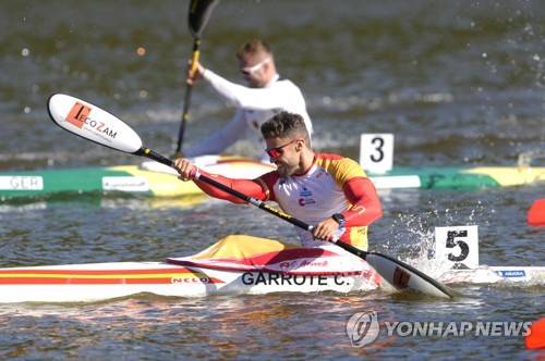 epa09476345 Carlos Garrote of Spain in action during the Mens K1 Kayak 200 meter final at the Canoe and Kayak sprint World Championsships 2021 at Bagsvaerd Lake, in Copenhagen, Denmark, 19 September 2021. EPA/Keld Navntoft DENMARK OUT