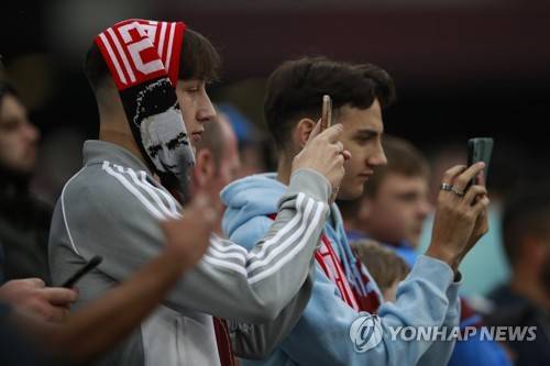 Fans take photographs ahead of the English Premier League soccer match between West Ham United and Manchester United at the London Stadium in London, England, Sunday, Sept. 19, 2021. (AP Photo/Ian Walton)