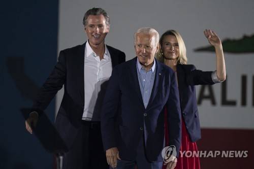 FILE — In this Sept. 13, 2021, file photo President Joe Biden, center, smiles to the crowd as he is flanked by California Gov. Gavin Newsom and Jennifer Siebel Newsom at a rally ahead of the California gubernatorial recall election in Long Beach, Calif. In the recall election, Newsom won big in coastal urban areas such as Los Angeles County, while the pro-recall side performed better in California's Central Valley and northern areas. (AP Photo/Jae C. Hong, File) SEPT. 12, 2021 FILE PHOTO