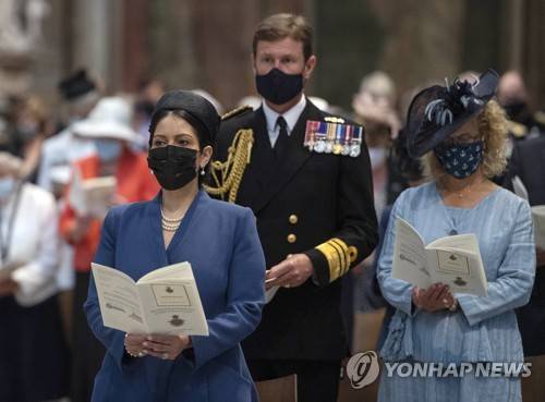 Britain's Home Secretary Priti Patel, left, attends a service to mark the 81st Anniversary of the Battle of Britain at Westminster Abbey in London Sunday Sept. 19, 2021. (Julian Simmonds/Pool via AP) POOL