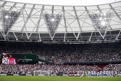 Players and fans commemorate Jimmy Greaves, one of England's greatest goal-scorers, ahead of the English Premier League soccer match between West Ham United and Manchester United at the London Stadium in London, England, Sunday, Sept. 19, 2021. Greaves who was prolific for Tottenham, Chelsea and AC Milan has died. He was 81. With 266 goals in 379 appearances, Greaves was the all-time record scorer for Tottenham, which announced his death on Sunday, Sept. 19, 2021. (AP Photo/Ian Walton)
