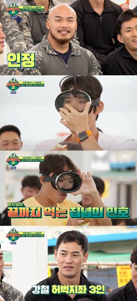 이어 김태술과 박태환에게도 물이 공급됐다. 눈 뜨고 안정적으로 시작한 박태환은 망설임 없이 사과 먹방을 선보였다. 여유롭게 사과 먹방을 펼치는 세 사람의 모습에 깜짝 놀란 '강철부대'. 황충원은 엄지를 보여주며 인정하는 모습을 보였다. 또, 허민호는 핀 마스크를 착용하고 사과 먹방을 보이다 축구까지 하는 여유를 보였다.