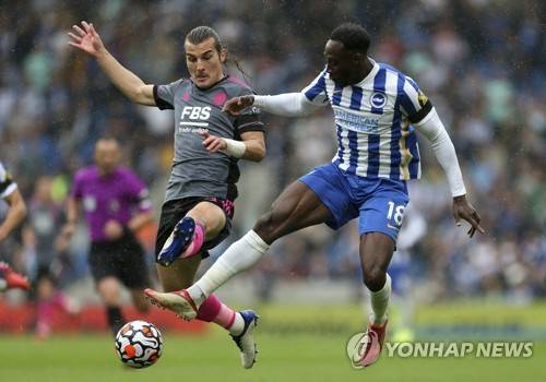 Leicester City's Caglar Soyuncu (left) and Brighton and Hove Albion's Danny Welbeck battle for the ball during the English Premier League soccer match between Brighton & Hove Albion and Leicester City at the AMEX Stadium, Brighton, England, Sunday Sept. 19, 2021. (Steven Paston/PA via AP) UNITED KINGDOM OUT NO SALES NO ARCHIVE PHOTOGRAPH CANNOT BE STORED OR USED FOR MORE THAN 14 DAYS AFTER THE DAY OF TRANSMISSION