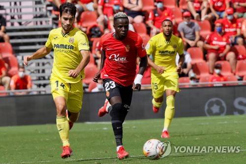epa09476368 RCD Mallorca's midfielder Amath Ndiaye (C) vies for tha ball against Trigueros (L) during a LaLiga soccer match between RCD Mallorca and Villarreal CF at Son Moix stadium in Palma, Balearic Islands, Spain, 19 September 2021. EPA/Cati Cladera