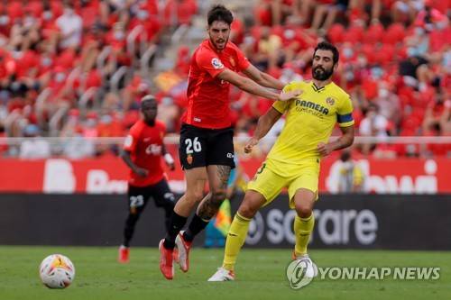 epa09476369 RCD Mallorca's player Fer Nino (L) vies for tha ball against Raul Albiol during a LaLiga soccer match between RCD Mallorca and Villarreal CF at Son Moix stadium in Palma, Balearic Islands, Spain, 19 September 2021. EPA/Cati Cladera