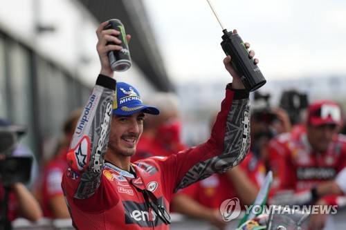 epa09476379 Francesco Bagnaia of Italy, Ducati Lenovo Team, celebrates winning the MotoGp Race at the Grand Prix of San Marino and the Riviera of Rimini, Misano Adriatico, Italy, 19 September 2021. EPA/DANILO DI GIOVANNI