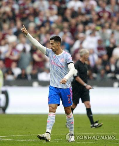 Manchester United's Cristiano Ronaldo celebrates after scoring his side's first goal during the English Premier League soccer match between West Ham United and Manchester United at the London Stadium in London, England, Sunday, Sept. 19, 2021. (AP Photo/Ian Walton)