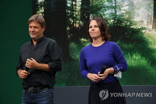 epa09476385 German Alliance 90/The Greens Party chancellor candidate Annalena Baerbock (R) and co-party leader Robert Habeck (L) conclude a party congress one week ahead of federal parliamentary elections, in Berlin, Germany, 19 September 2021. Federal elections are scheduled for 26 September. EPA/Sean Gallup / POOL