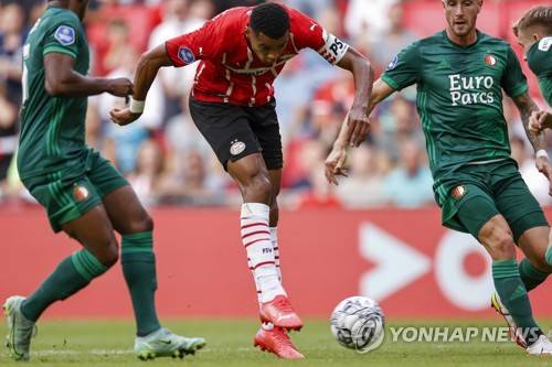 epa09476400 Cody Gakpo (C) of PSV Eindhoven in action during the Dutch Eredivisie match between PSV and Feyenoord at Phillips Stadium in Eindhoven, Netherlands, 19 September 2021. EPA/MAURICE VAN STEEN