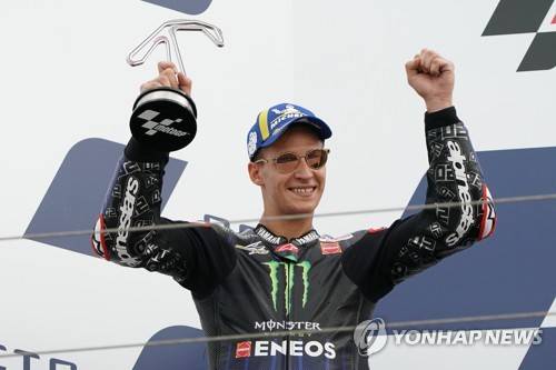 epa09476401 Fabio Quartararo of France, Monster Energy Yamaha MotoGP, celebrates the second place of the MotoGp Race at the Grand Prix of San Marino and the Riviera of Rimini, Misano Adriatico, Italy, 19 September 2021. EPA/DANILO DI GIOVANNI