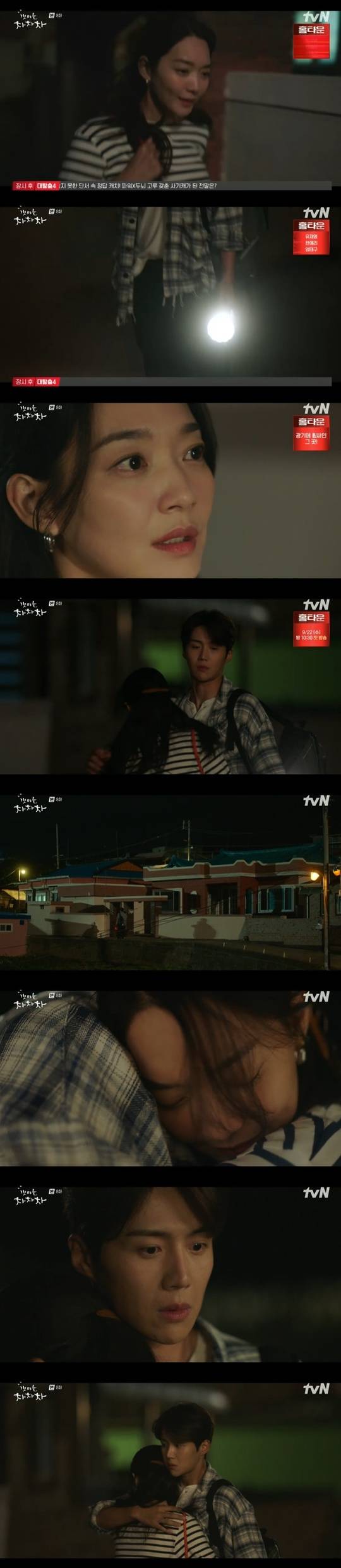윤혜진은 조남숙을 이해 “보철물 잘 붙였는지 확인하게 병원에 한 번 와라. 다시 한 번 그러면 둘 다 콩밥 먹이겠다”고 말하며 화해했다. 그날 밤 퇴근길 윤혜진은 가로등 불이 나간 데다가 핸드폰 배터리도 없는 상태에서 괴한의 미행을 느끼고 도망치다 홍두식을 발견하자 달려가 포옹했다. (사진=tvN ‘갯마을 차차차’ 캡처)