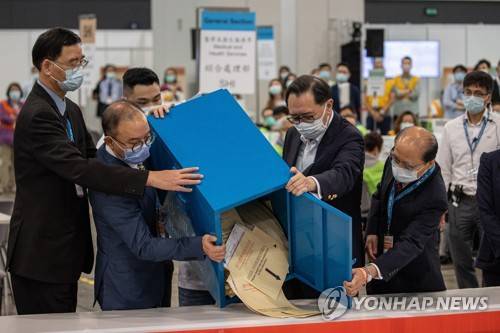 epa09476406 Government officials open a ballot box as vote counting starts at the Convention Centre, during the 2021 Election Committee Subsector Ordinary Elections in Hong Kong, China, 19 Sept. 2021. The Election Committee is an electoral college with the function of selecting the Chief Executive and to elect 40 members of the 90 members of the Legislative Council. In 2021 China?s National People's Congress passed a law that changed the electoral system in the former British colony, augmenting the size of the Election Committee to 1,500 members to include 'patriotic groups' and members of the Chinese People?s Political Consultative Conference among others. Only 364 places on the 1,500-member Election Committee are up for grabs with most seats predetermined as uncontested or appointed and only 4,889 voters representing different professions and trades casting their ballots. EPA/JEROME FAVRE