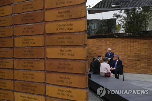 Name stones are seen in the foreground as King Willem-Alexander, right, talks to survivors and relatives after officially unveiling a new monument in the heart of Amsterdam's historic Jewish Quarter on Sunday, Sept. 19, 2021, honoring the 102,000 Dutch victims of the Holocaust. Designed by Polish-Jewish architect Daniel Libeskind, the memorial is made up of walls shaped to form four Hebrew letters spelling out a word that translates as "In Memory Of." The walls are built using bricks each of which is inscribed with the name of one of the 102,000 Jews, Roma and Sinti who were murdered in Nazi concentration camps during World War II or who died on their way to the camps. (AP Photo/Peter Dejong)