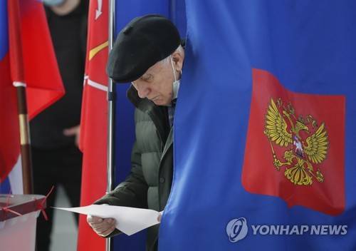 epaselect epa09476170 A man wearing a face mask to be protected against coronavirus infection votes in a polling station during the Parliamentary elections in St. Petersburg, Russia, 19 September 2021. Elections of deputies of the State Duma, governors, deputies of the regional and city runs from 17 September to 19 September. The main voting day will take place on 19 September, Voting in the State Duma takes place in one round according to a mixed system - 225 deputies must be elected from party lists and 225 deputies - from single-mandate constituencies. EPA/ANATOLY MALTSEV