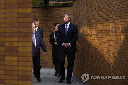 , right, walks along walls with name stones after officially unveiling a new monument in the heart of Amsterdam's historic Jewish Quarter on Sunday, Sept. 19, 2021, honoring the 102,000 Dutch victims of the Holocaust. Designed by Polish-Jewish architect Daniel Libeskind, the memorial is made up of walls shaped to form four Hebrew letters spelling out a word that translates as "In Memory Of." The walls are built using bricks each of which is inscribed with the name of one of the 102,000 Jews, Roma and Sinti who were murdered in Nazi concentration camps during World War II or who died on their way to the camps. (AP Photo/Peter Dejong)