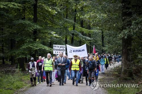 epa09476423 Protesters of the Republic association gather for a picnic at the Kroondomein Het Loo in Apeldoorn, The Netherlands, 19 September 2021. They protested against the annual closure of the area by King Willem-Alexander from 15 September to 25 December. EPA/Vincent Jannink