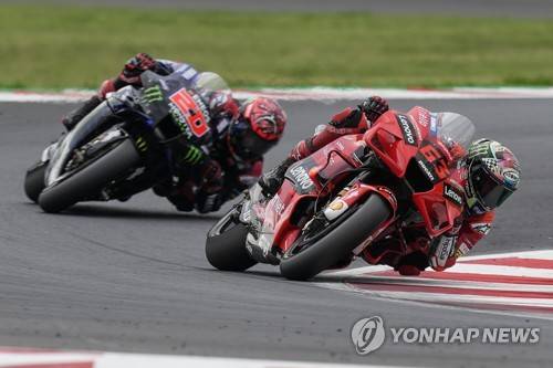 Italy's Francesco Bagnaia rides his Ducati ahead of France's Fabio Quartararo on Yamaha, to win the San Marino MotoGP race, at the Misano circuit in Misano Adriatico, Italy, Sunday, Sept. 19, 2021. Bagnaia won the race as Quartararo finished second. (AP Photo/Antonio Calanni)