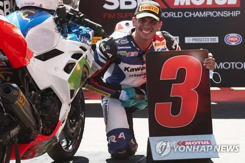epa09476430 French Worldssp300 rider Samuel Di Sora of Leader Team Flembbo celebrates his third place following the race 2 of the Hyundai N Catalunya WorldSBK Round 2021 held at Montmelo racetrack in Barcelona, Spain, 19 September 2021. EPA/Alejandro Garcia