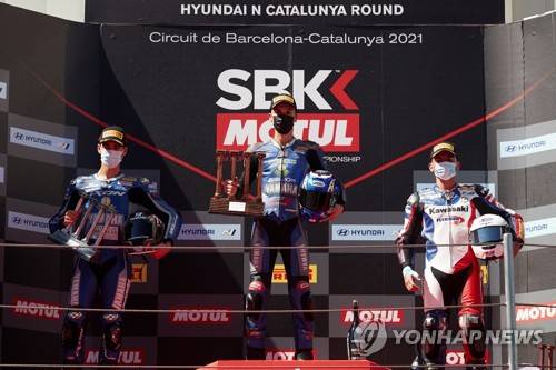 epa09476431 Turkish Worldssp300 rider Bahattin Sofuoglu (C) of Biblion Yamaha Motoxracing team, first place; Spanish Worldssp300 rider Alvaro Diaz Cebrian (L) of Arco Motor Unversity Team, second place, and French Worldssp300 rider Samuel Di Sora (R) of Leader Team Flembbo, third place celebrate on the podium following the race 2 of the Hyundai N Catalunya WorldSBK Round 2021 held at Montmelo racetrack in Barcelona, Spain, 19 September 2021. EPA/Alejandro Garcia