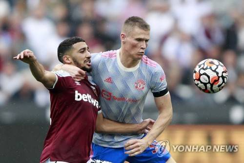 Manchester United's Scott McTominay, right, holds West Ham's Said Benrahma during the English Premier League soccer match between West Ham United and Manchester United at the London Stadium in London, England, Sunday, Sept. 19, 2021. (AP Photo/Ian Walton)