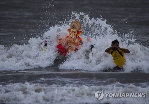 Volunteers immerse an idol of elephant-headed Hindu god Ganesha in the Arabian Sea, on the final day of the ten-day long Ganesh Chaturthi festival in Mumbai, India, Sunday, Sept. 19, 2021. The festival is a celebration of the birth of Ganesha, the Hindu god of wisdom, prosperity and good fortune. (AP Photo/Rafiq Maqbool)