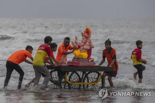 Volunteers prepare to immerse idols of elephant-headed Hindu god Ganesha in the Arabian Sea, on the final day of the ten-day long Ganesh Chaturthi festival in Mumbai, India, Sunday, Sept. 19, 2021. The festival is a celebration of the birth of Ganesha, the Hindu god of wisdom, prosperity and good fortune. (AP Photo/Rafiq Maqbool)