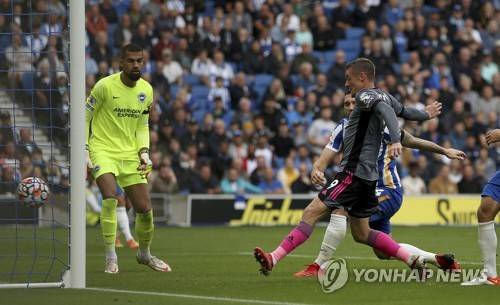 Leicester City's Jamie Vardy scores during the English Premier League soccer match between Brighton & Hove Albion and Leicester City at the AMEX Stadium, Brighton, England, Sunday Sept. 19, 2021. (Steven Paston/PA via AP) UNITED KINGDOM OUT NO SALES NO ARCHIVE PHOTOGRAPH CANNOT BE STORED OR USED FOR MORE THAN 14 DAYS AFTER THE DAY OF TRANSMISSION
