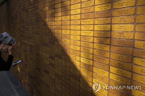 People look for name stones of relatives after King Willem-Alexander officially unveiled a new monument in the heart of Amsterdam's historic Jewish Quarter on Sunday, Sept. 19, 2021, honoring the 102,000 Dutch victims of the Holocaust. Designed by Polish-Jewish architect Daniel Libeskind, the memorial is made up of walls shaped to form four Hebrew letters spelling out a word that translates as "In Memory Of." The walls are built using bricks each of which is inscribed with the name of one of the 102,000 Jews, Roma and Sinti who were murdered in Nazi concentration camps during World War II or who died on their way to the camps. (AP Photo/Peter Dejong)