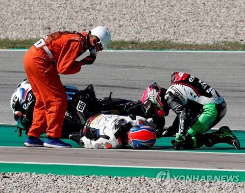 epa09476458 British Worldssp300 rider Tom Sykes (C) of Motorrad WorldSBK Team and French Worlssp300 rider Lucas Mahias (R) of Kawasaki Puccetti Racing react after crashing during the race 2 of the Hyundai N Catalunya WorldSBK Round 2021 held at Montmelo racetrack in Barcelona, Spain, 19 September 2021. EPA/Alejandro Garcia