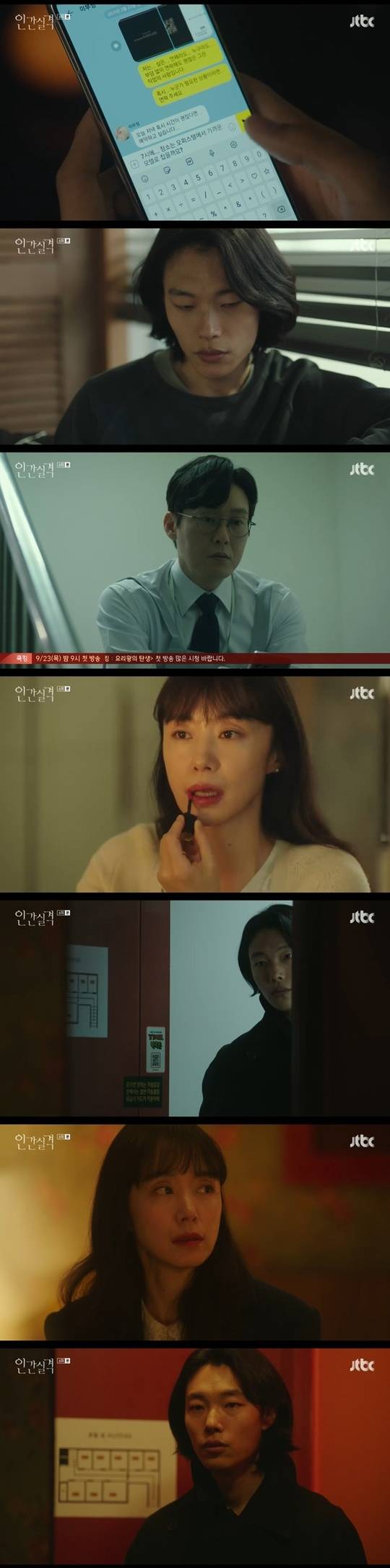 부정은 남편 정수(박병은 분)에게 “오늘 늦을지도 몰라. 많이 늦으면 아버지 집에서 자고 갈게”라고 문자를 보내고 강재를 만나러 갔다. 강재는 ‘나는 여전히 당신이 왜 스스로 삶을 포기하려 했는지. 이곳을 떠나 어디로 가려고 했는지 전혀 이해할 수 없습니다. 이해할 수도 알 수도 없습니다’고 속말하며 부정과 만났다. (사진=JTBC ‘인간실격’ 캡처)