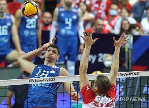 epa09477141 Piotr Nowakowski (R) from Poland in action against Marko Podrascanin (L) from Serbia in the match for the third place of the Men's European Volleyball Championship between Poland and Serbia in Katowice, Poland 19 September 2021. EPA/ANDRZEJ GRYGIEL POLAND OUT