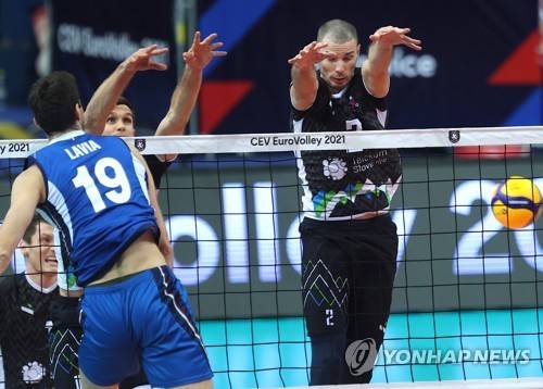 epa09477216 Daniele Lavia (L) of Italy in action against Slovenia's Alen Pajenk (R) during the 2021 Men's European Volleyball Championship final match between Slovenia and Italy in Katowice, Poland, 19 September 2021. EPA/ANDRZEJ GRYGIEL POLAND OUT