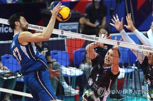 epa09477218 Simone Anzani (L) of Italy in action against Slovenia's Tonck Stern (C) during the 2021 Men's European Volleyball Championship final match between Slovenia and Italy in Katowice, Poland, 19 September 2021. EPA/ANDRZEJ GRYGIEL POLAND OUT