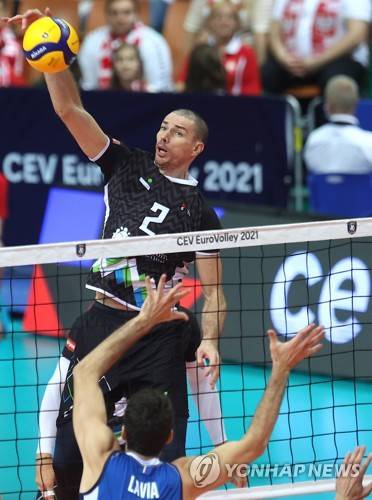 epa09477220 Alen Pajenk (back) of Slovenia in action during the 2021 Men's European Volleyball Championship final match between Slovenia and Italy in Katowice, Poland, 19 September 2021. EPA/ANDRZEJ GRYGIEL POLAND OUT