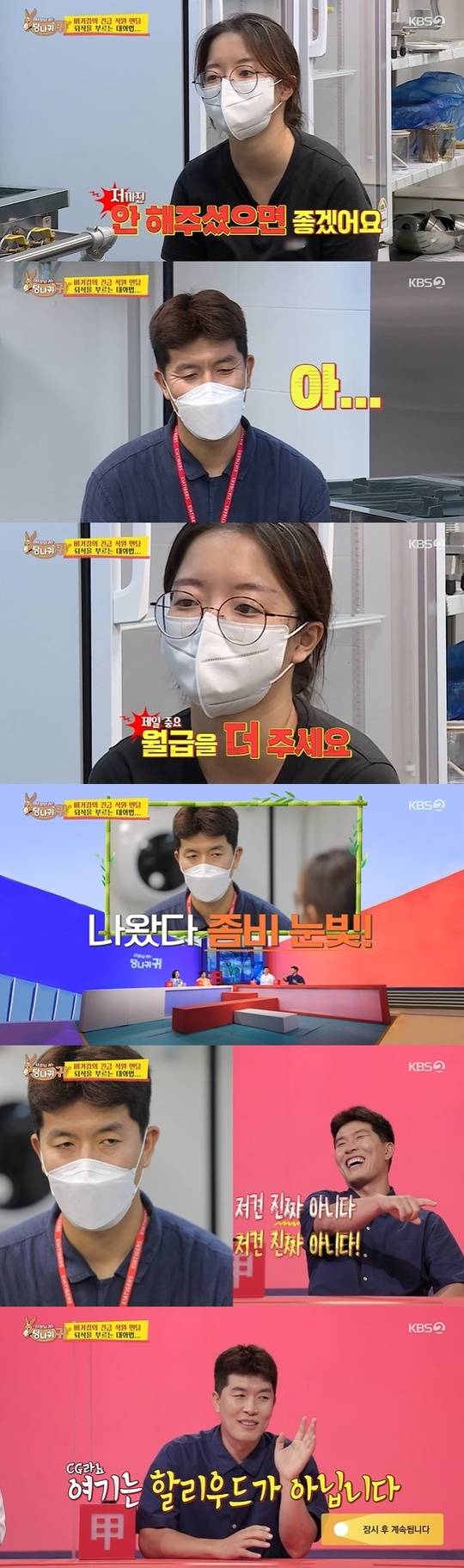 또한 은정은 "월급을 더 달라"고도 말했다. 그러자 갑자기 좀비 눈빛으로 돌변한 김병현. 스튜디오의 김병현은 경악하는 MC들에 "저건 진짜 아니다. CG다"라며 억울함을 표현해 웃음을 자아냈다.