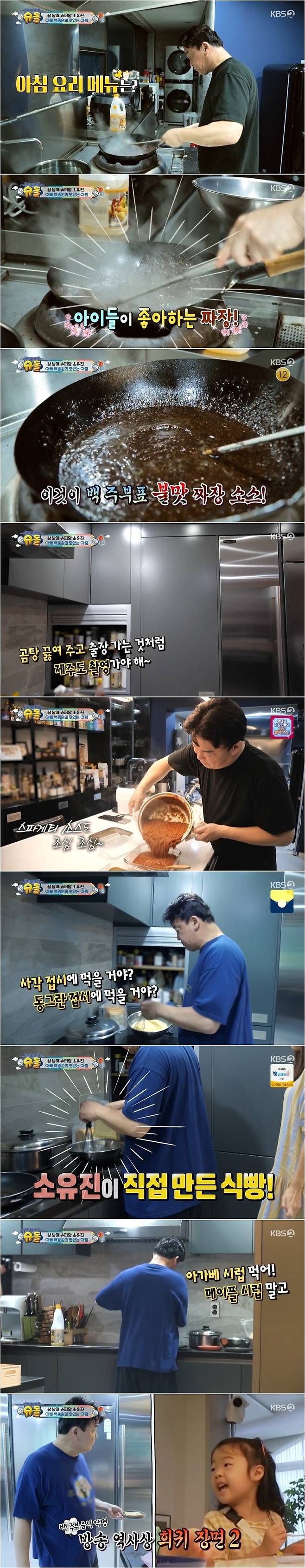 이들 가족의 아침은 백종원의 요리로 시작됐다. 방송을 통해 공개된 백종원♥소유진 부부의 집 주방은 마치 식당을 연상시켰는데, 가정집에서는 보기 힘든 화구가 설치돼 있어서 눈길을 끌기 충분했다. 각종 향신료와 소스들로 가득 채워진 진열대 또한 감탄을 자아냈고, 아이들의 장난감마저 요리와 관련된 것들이어서 이목을 사로잡았다.