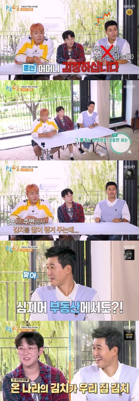 제작진은 "김종민 씨 어머님 김장 하신다"며 "김종민은 김치를 여기저기서 받아 드신다고 하셨다. 부동산에서도?"라고 물었다.
