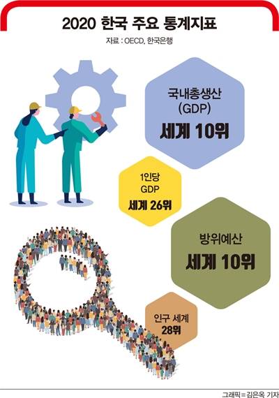 [편집자주]2020년 국내총생산(GDP) 1조5868억달러, 세계 10위의 경제대국. 글로벌 수출 6위·수입 9위의 무역강국. 글로벌 사회에서 한국을 수식하는 지표다. 불과 70년 전 전쟁으로 폐허가 된 땅에서 한국은 ‘한강의 기적’으로 성장의 기반을 다지고 글로벌 금융위기를 두 차례나 이겨내며 위기에 강한 DNA를 심었다. 이를 바탕으로 한국은 지난해 글로벌 경제를 덮친 신종 코로나바이러스 감염증(코로나19) 팬데믹(세계적 감염병 대유행) 속에서도 주요 선진국보다 빠르고 강력한 회복세를 보이며 세계의 모범국가로 거듭나고 있다. 단순한 자화자찬이 아니다. 주요 7개국(G7) 정상회의에 2년 연속 초청을 받아 사실상 G8 국가로서의 위상을 인정받고 있으며 유엔무역개발회의(UNCTAD)는 한국을 선진국으로 공식 인정했다. 국제 원조 없이는 생존조차 어려웠던 최빈국에서 ‘잘 사는 나라’를 넘어 ‘글로벌 리더국’으로 나아가고 있는 대한민국의 행보를 따라가봤다.