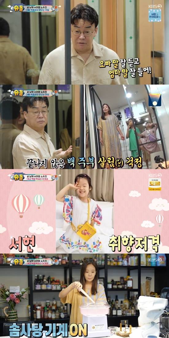 이날 '제1대 슈퍼맘 가족' 소유진이 등장해 아침 일상을 공개했다. 출장 전 아침부터 아이들을 위해 짜장과 카레, 스파게티 소스를 만들던 백종원. "아빠 자고 올거다"라며 출장을 떠나려는 백종원은 자녀 용희, 서현, 세은이와 굿바이 인사를 하는 모습이 공개됐다. 쿨하게 굿바이를 하던 용희와는 달리 작별 뽀뽀를 하는 서현과 세은이는 인사부터 경례, 뽀뽀를 하는 애교 많은 막내딸의 모습을 보여 미소를 유발했다.