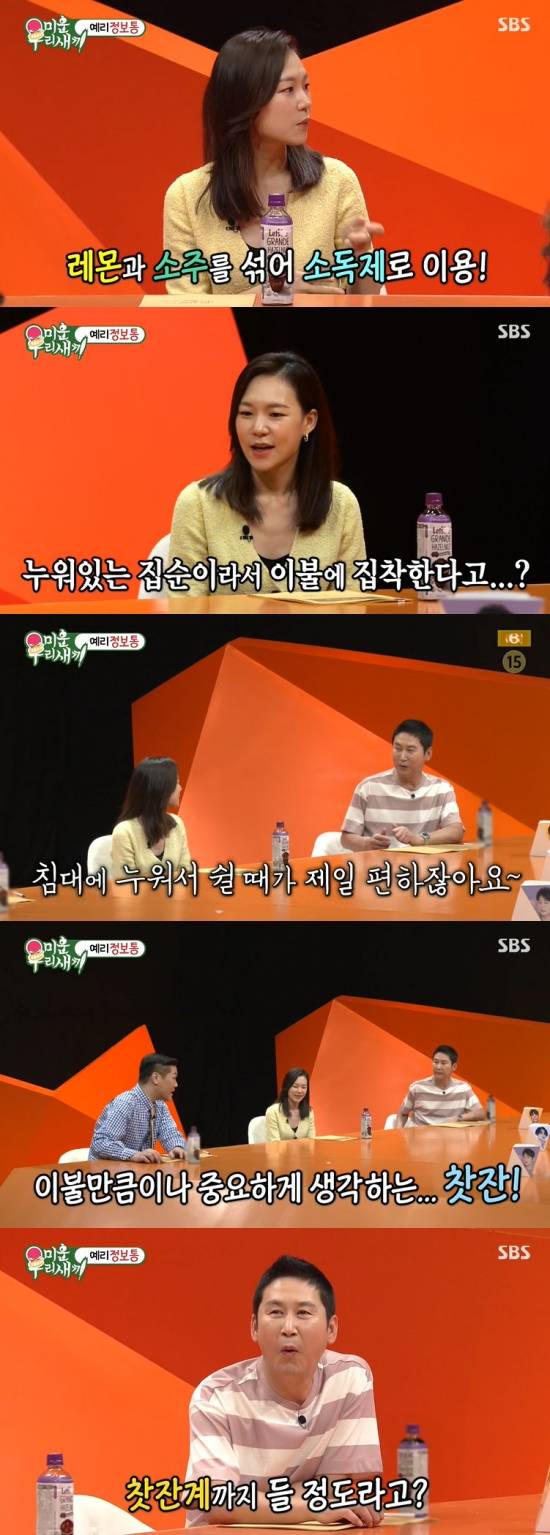 서장훈은 "쉴 때는 집에서 안 나오고 누워있다고 한다. 이불에 집착한다더라"라며 물었고, 한예리는 "일 끝나고 쉬면 에너지를 많이 쓰다 보니까 일주일 정도는 집에 있다. 침구가 되게 중요하더라. 두께랑 무게랑 살에 닿는 촉감 그런 게 되게 중요해졌다"라며 설명했다.