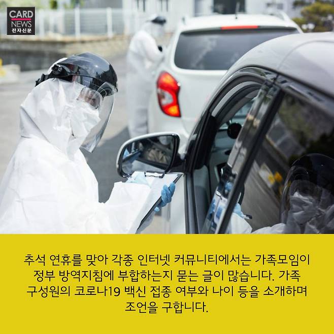 추석 연휴를 맞아 각종 인터넷 커뮤니티에서는 가족모임이 정부 방역지침에 부합하는지 묻는 글이 많습니다. 가족 구성원의 코로나19 백신 접종 여부와 나이 등을 소개하며 조언을 구합니다.