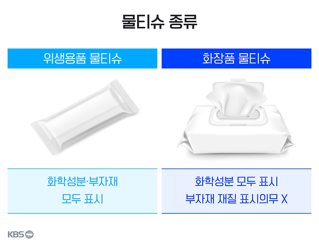 물티슈는 크게 '화장품 물티슈'와 '위생용품 물티슈'로 나뉩니다. 식당에서 손 닦는 용도로 손님에게 주는 물티슈는 '위생용품 물티슈', 마트나 편의점에서 살 수 있는 물티슈 제품은 '화장품 물티슈'라고 보면 됩니다.