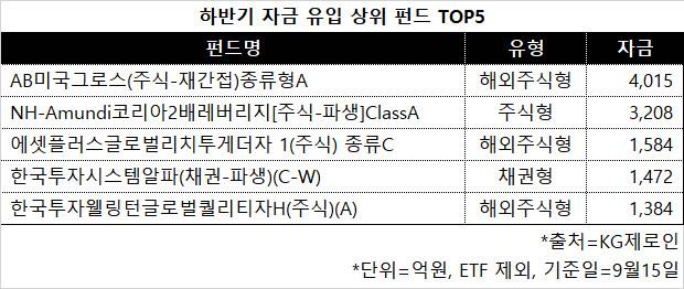 20일 펀드평가사 KG제로인에 따르면 지난 15일 기준 지난 7월 이후 이날까지 가장 많은 신규 설정이 이뤄진 펀드(ETF 제외)는 ‘AB미국그로스(주식-재간접)’(4015억원)였다. 운용순자산 2억1459억원으로 북미 주식형 펀드 중 가장 큰 규모를 자랑하는 펀드다. ‘에셋플러스글로벌리치투게더’(1584억원), ‘한국투자웰링턴글로벌퀄리티’(1384억원) 등도 하반기 순매수 펀드 상위에 올랐다.