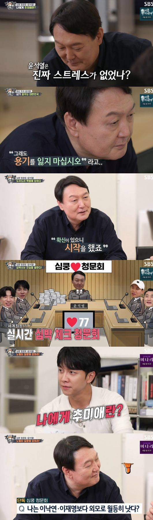 '윤석열에게 추미애란?' 스트레스 받지 않았는지 묻자 그는 "받을 일이 뭐있었겠나"고 답하면서도 거짓말 탐지기를 대동하자 거짓이 나와 폭소하게 했다. 이어 '여기 모두 날 안 뽑아도 괜찮다'는 질문엔 "아니다, 달걀말이도 해줬는데"라며솔직한 입담으로 폭소를 안겼다.